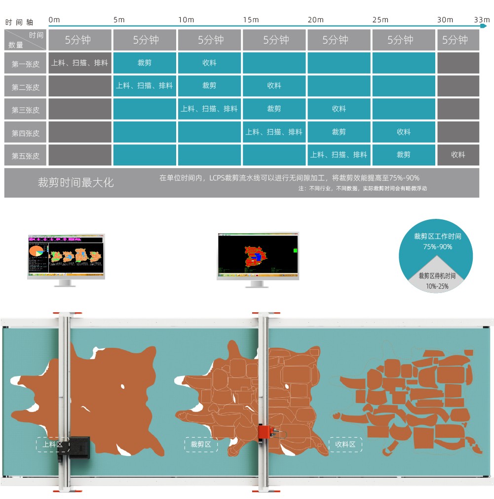 LCPS真皮裁剪流水線系統(tǒng)采用高清全彩真皮輪廓采集系統(tǒng),通過掃描提取真皮不規(guī)則輪廓形狀、面積、瑕疵等信息,配合全自動排料系統(tǒng),產(chǎn)生優(yōu)化的裁剪方案,三段式流水工作平臺,發(fā)揮裁...